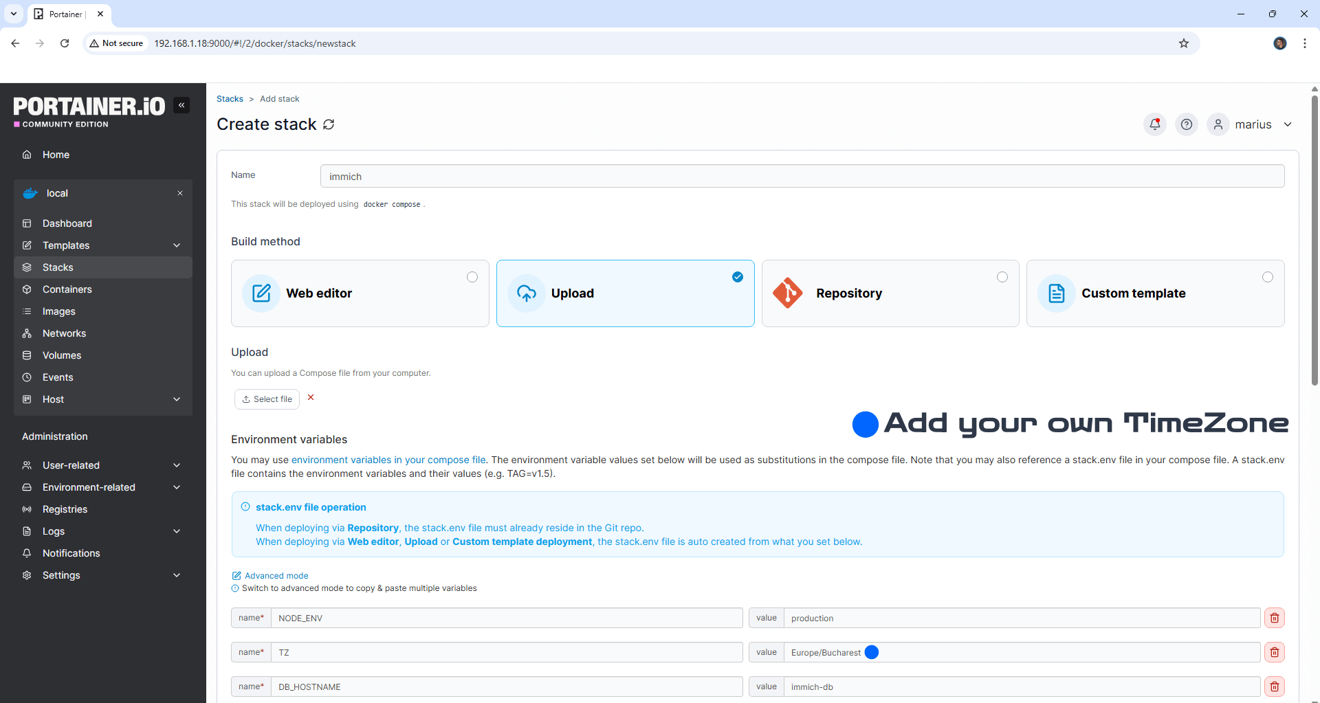 - portainer 접속 후 Stack - Add Stack 클릭, 이름 적고 web editor에 하단 본문 작성